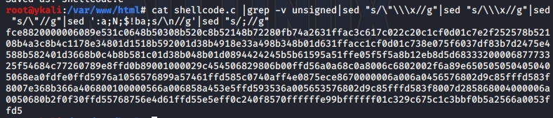 >cat shellcode.c |grep -v unsigned|sed "s/\"\\\x//g"|sed "s/\\\x//g"|sed "s/\"//g"|sed ':a;N;$!ba;s/\n//g'|sed "s/;//g"