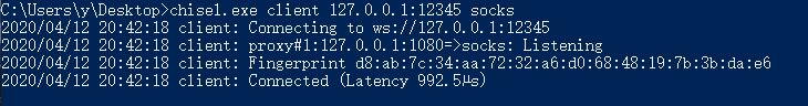 >chisel.exe client 127.0.0.1:12345 socks当隧道建立成功时,攻击机本地会启动1080端口即可使用