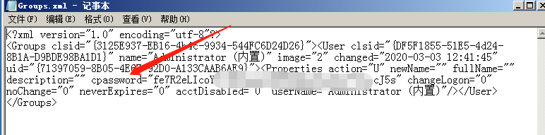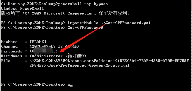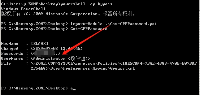 域内机器可访问\\zone.com\SYSVOL\zone.com共享文件夹,翻看策略文件,查找groups.xml,ScheduledTasks\ScheduledTasks.xml,Printers\Printers.xml,Drives\Drives.xml,DataSources\DataSources.xml, Services\Services.xml等文件