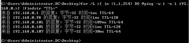 >for /L %I in (1,1,254) DO @ping -w 1 -n 1 192.168.0.%I |findstr "TTL="