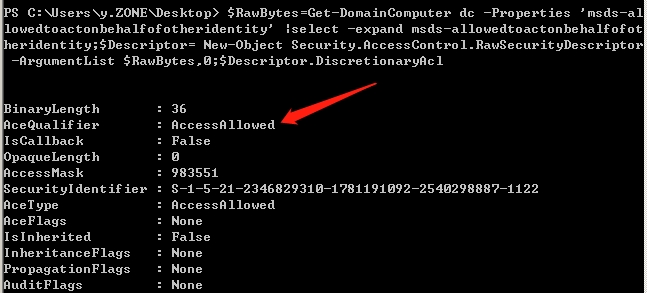 >$RawBytes=Get-DomainComputer dc -Properties 'msds-allowedtoactonbehalfofotheridentity' |select -expand msds-allowedtoactonbehalfofotheridentity;$Descriptor= New-Object Security.AccessControl.RawSecurityDescriptor -ArgumentList $RawBytes,0;$Descriptor.DiscretionaryAcl