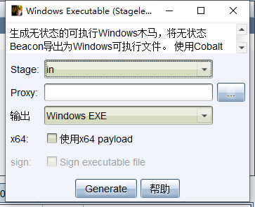 选择 Attacks->Packages->Windows Executable(Stageless)