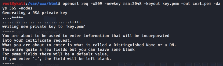 >openssl req -x509 -newkey rsa:2048 -keyout key.pem -out cert.pem -days 365 -nodes