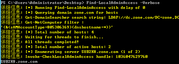>Get-NetComputer -Domain zone.com>Find-LocalAdminAccess -verbose 查询域内本地用户能登录的机器Dev-powerview