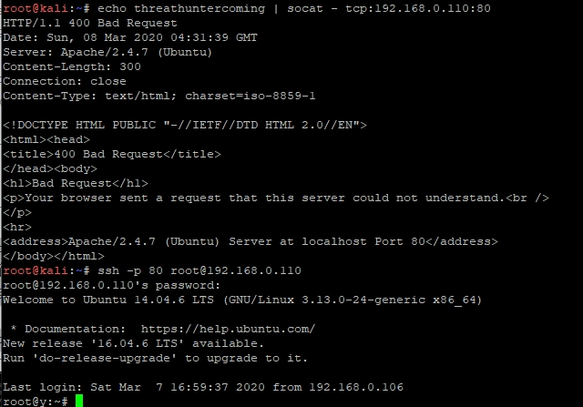>echo threathuntercoming | socat - tcp:192.168.0.110:80