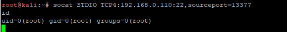 >socat STDIO TCP4:192.168.0.110:22,sourceport=13377