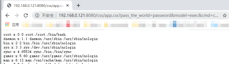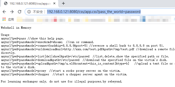 http://192.168.0.121:8080/css/app.css?pass_the_world=password可执行命令,反弹shell,上传/下载文件,列目录,读文件,添加代理,连接菜刀From:https://mp.weixin.qq.com/s/7b3Fyu_K6ZRgKlp6RkdYoA