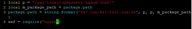 在lua目录/waf/中新建Init.lua,内容如下,require nginx表示加载nginx.lua中的模块。