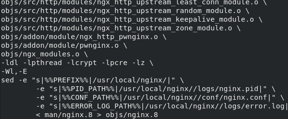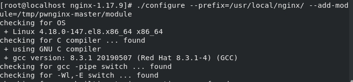 >./configure --prefix=/usr/local/nginx/ --add-module=/tmp/pwnginx-master/module