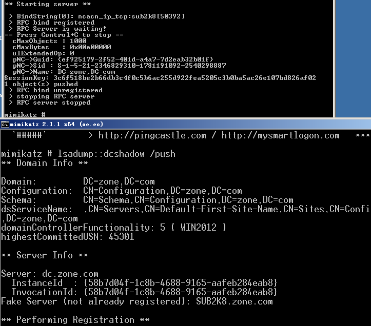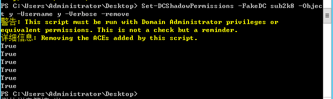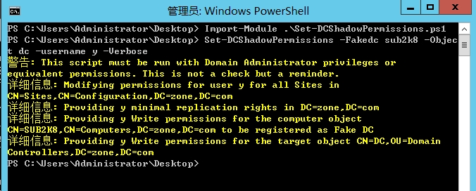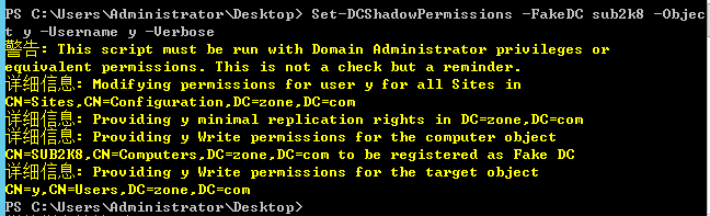 >Set-DCShadowPermissions -Fakedc sub2k8 -Object dc -username y –Verbose