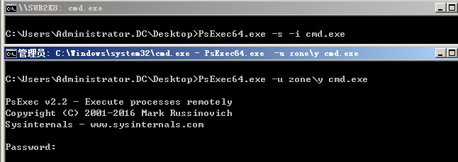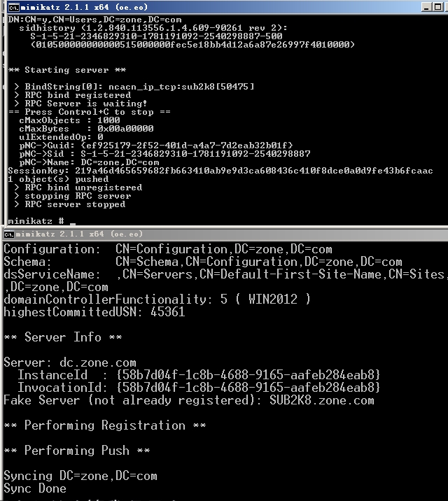 在sub2k8上,以本地system权限启动一个mimikatz会话,以zone\y权限启动一个mimikatz会话。